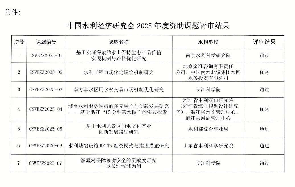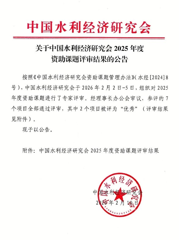 中国水利经济研究会于2026年2月2日-5日,组织对2025年度资助课题进行了专家评审。其中,由北京金准咨询有限责任公司会同中国南水北调集团水网水务投资有限公司共同完成的《水利工程市场化定调价机制研究》课题,顺利通过评审并获评“优秀”。
